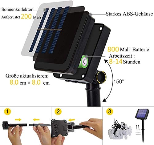 Łatwy montaż i: Łatwy montaż i obsługa – za pomocą tej solarnej lancy świetlnej można łatwo ozdobić przestrzeń na zewnątrz, bez konieczności użycia dodatkowych przewodów elektrycznych. Można je zainstalować wokół drzew, sufitu, tarasu. Istnieją tylko dwa przełączniki (włączanie/wyłączanie i tryb świecenia) do stero