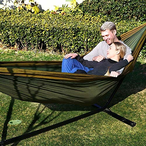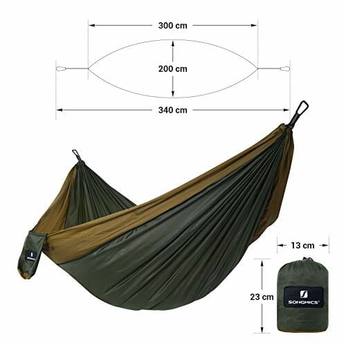 SONGMICS Ultralekki hamak, dla 2 osób, z nylonu ripstop, obciążenie do 300 kg, 300 x 200 cm, na podróż z plecakiem, kemping, wędrówki, zieleń wojskowa, brązowy GDC20AC