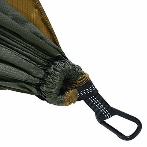 • Możliwość zawieszenia w dowolnym miejscu: w zakres dostawy wchodzą 2 pasy mocujące oraz karabińczyki, dzięki czemu hamak można bez problemu zawiesić na zewnątrz. Dzięki 16 szlufkom na pasek odległość między drzewami może się spokojnie zmieniać; ponadto można regulować wysokość hamaka