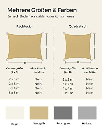 - [Wählen Sie die richtige Größe] Wählen Sie die richtige Größe, je nachdem wie groß der verfügbare Platz zum Anbringen des Segeltuchs und wie groß die gewünschte schattige Fläche ist. Sehen Sie die detaillierten Größen-Angaben auf den Produktbildern