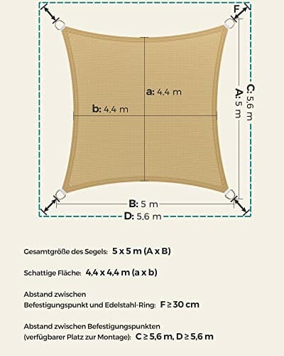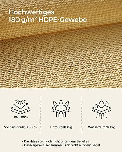 - [Luftdurchlässig & wasserdurchlässig] Dieses 5 x 5 m große Sonnensegel besteht aus 180 g/m² HDPE-Gewebe und ist luft- und wasserdurchlässig, damit sich die Sommerhitze nicht unter dem Sonnensegel anstaut. Dieses Sonnensegel eignet nicht als Regenschutz