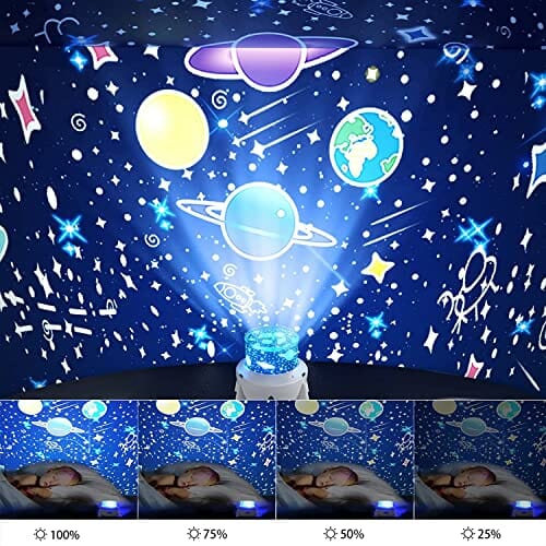 • 7 kolorów trybów oświetlenia i regulowana jasność – lampka nocna dla dzieci z 4 ulepszonymi lampami LED (biały, niebieski, zielony, czerwony), projekcja znacznie szersza i jaśniejsza, ma również 7 różnych trybów kolorów (biały, niebieski, zielony, czerwony, wielokolorowy gradient, biały i niebieski, zielony i czerwony) oraz 4 tryby jasności oświetlenia (20%, 50%, 70%, 100%), aby spełnić wymagania otoczenia. Kiedy kładziesz się spać, możesz użyć białego klosza projektora gwiezdnego jako lampki nocnej LED.
