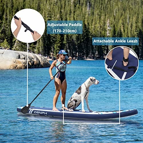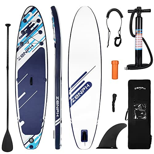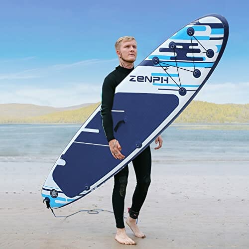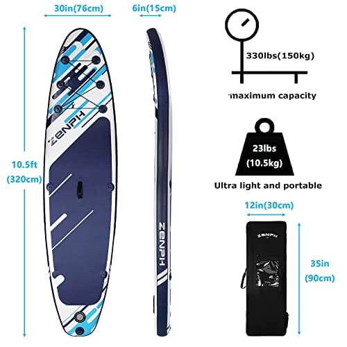 • Wysokiej jakości materiał: Wykonany z wysokiej jakości materiału PVC, Zenph SUP nie ulega łatwo deformacji ani blaknięciu, a także z super odpornością na zużycie, wytrzymałością i długą żywotnością. Jest bezpieczny i gładki w wodzie, a specjalny wzór zapewni Ci bardzo przyjemne wrażenia z wody. Nadmuchiwane deski wiosłowe mają standardowy rozmiar 320 x 76 x 15 cm (10,5 x 30 x 6 cali), dzięki czemu można go przenosić 333 funty/150 kg.