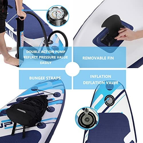 • Szybkie nadmuchiwanie i spuszczanie powietrza: W zestawie z wysokiej jakości pompką uchwytu, możesz łatwiej napompować lub spuszczać powietrze w krótszym czasie, zwykle 5 minut na nadmuchanie i 3 minuty na spuszczanie powietrza. Wrażliwy barometr zapewnia, że możesz w każdej chwili odczytać wartość ciśnienia pompowania sup.