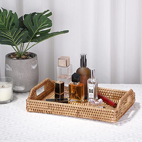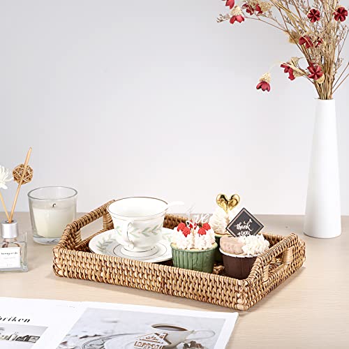 Sumnacon Kwadratowa rattanowa tkana taca do serwowania, dekoracyjna taca ekspozycyjna, patera do przechowywania z uchwytem, organizer na stół, na napoje, śniadanie, herbatę, świecę