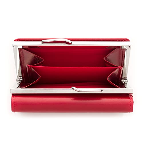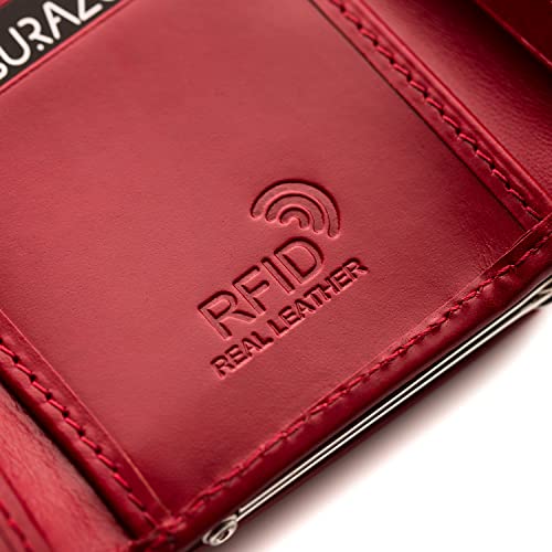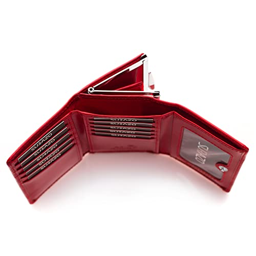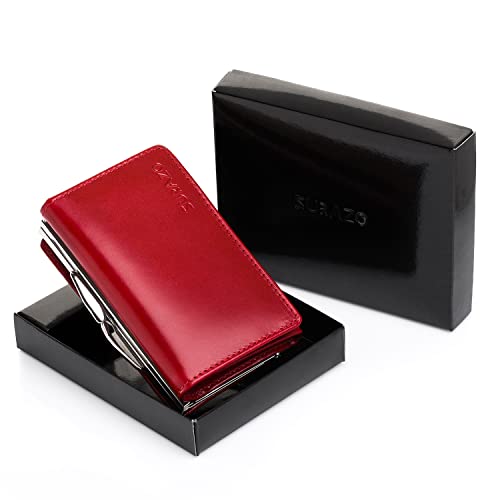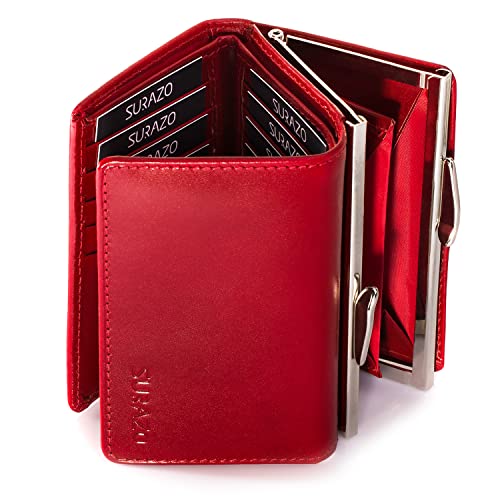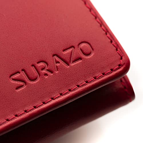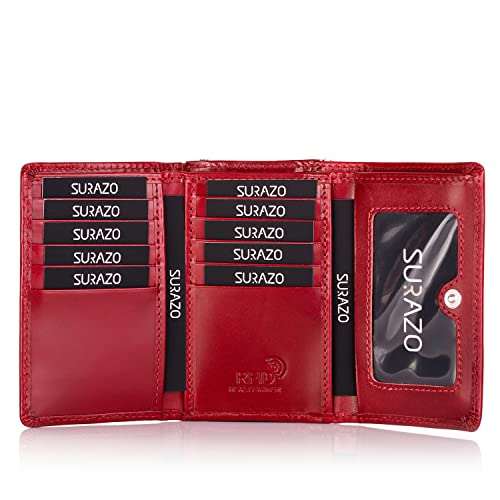 SURAZO® Skórzany portfel damski, mały, wiele przegródek – portfel damski z 12 przegródkami na karty [ochrona RFID] [przegródka na monety] prawdziwa skóra portfel damski portfel z klapką, czerwony, m