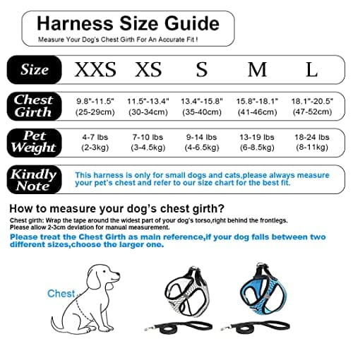 • 【UWAGA 】- XXS (klatka piersiowa: 25 – 29 cm), XS (klatka piersiowa: 30 – 34 cm), S (klatka piersiowa: 35 – 39 cm), M (klatka piersiowa: 41 – 46 cm), L (klatka piersiowa: 47 – 52 cm). Te szelki są odpowiednie tylko dla małych psów i kotów, nie kupuj w oparciu o swoje stare doświadczenia, zawsze zmierz obwód klatki piersiowej swojego zwierzaka przed złożeniem zamówienia.