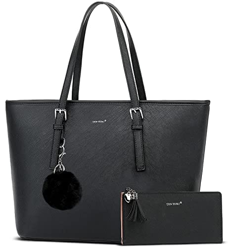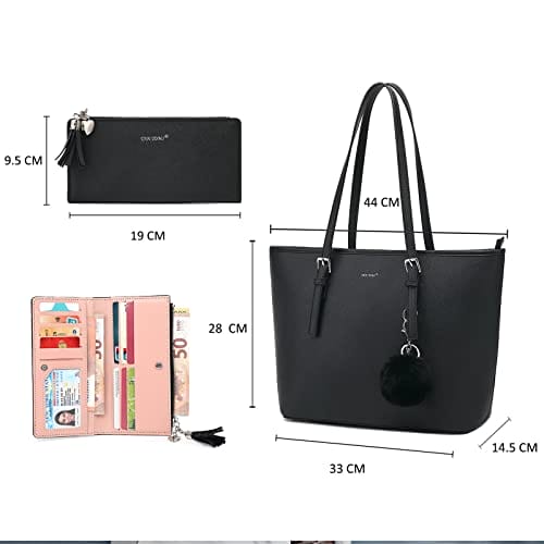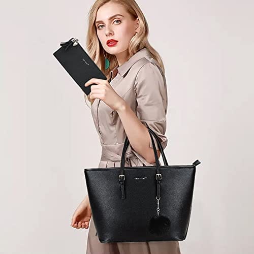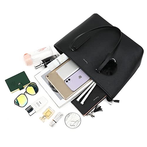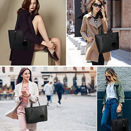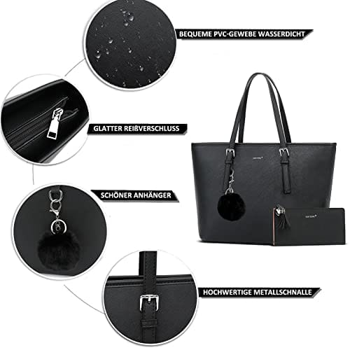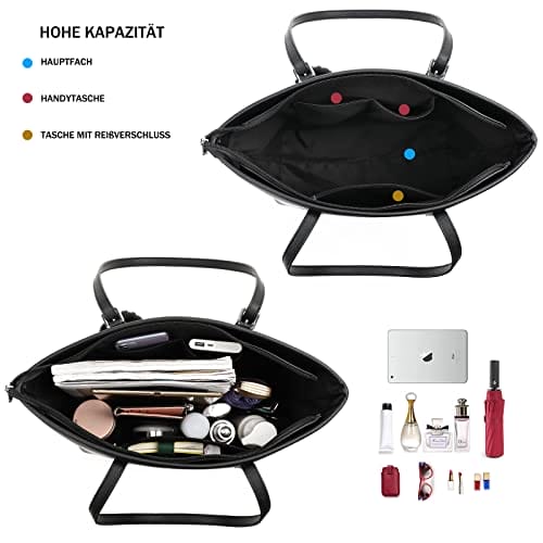 - 【Super Große Kapazität】:Die handtasche damen schwarz hat vier Taschen und enthält ein Hauptbeutel, ein Reißverschlusstasche, eine Handytasche und ein Zertifikatspaket. Mit diesen Damen Handtaschen können Sie alle Ihre täglichen Notwendigkeiten wie Brieftaschen, 13 „dünnen Laptop, Handys, Regenschirm, A4-Magazin, Kosmetik und vieles mehr portieren.