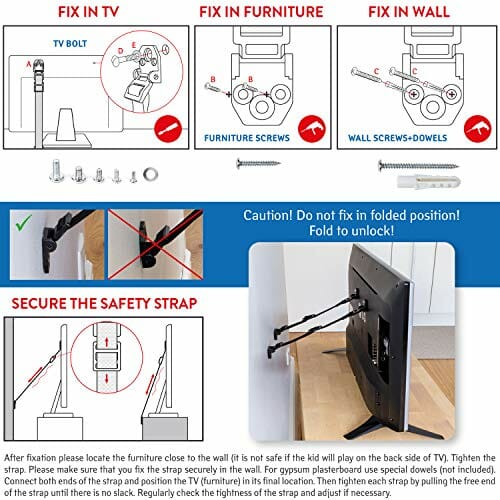 ✅ ✅ Łatwy montaż:: ✅ Łatwy montaż: ochrona przed przewróceniem się do telewizora i mebli jest dostarczana z zestawem śrub do mebli i ścian w popularnym formacie oraz instrukcją obsługi (może nie być dostępna w języku polskim), która pomoże Ci krok po kroku podczas mocowania.
