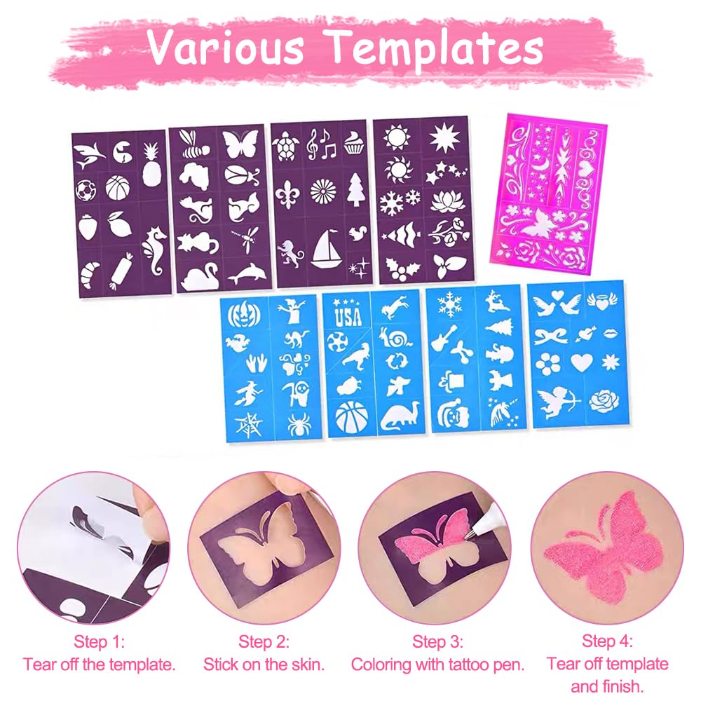 - ❥Tatoostift Set: Tattoo Stifte Kinder set enthält 6 tatoostift, 9 Schablone und 2 Blätter Glitzersteine Gesicht. Stimulieren Sie die Kreativität der Kinder, 17 in 1 Packung erfüllen Sie die Bedürfnisse.
