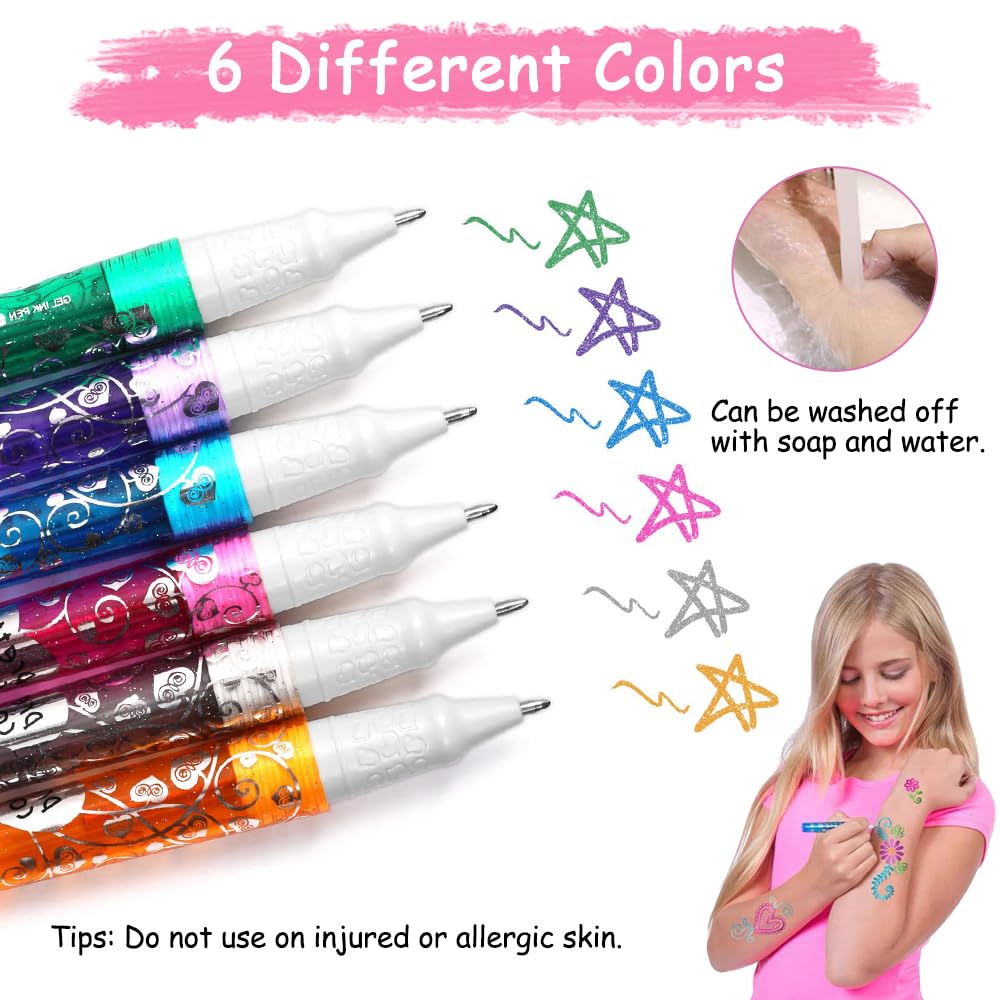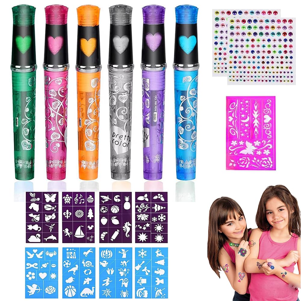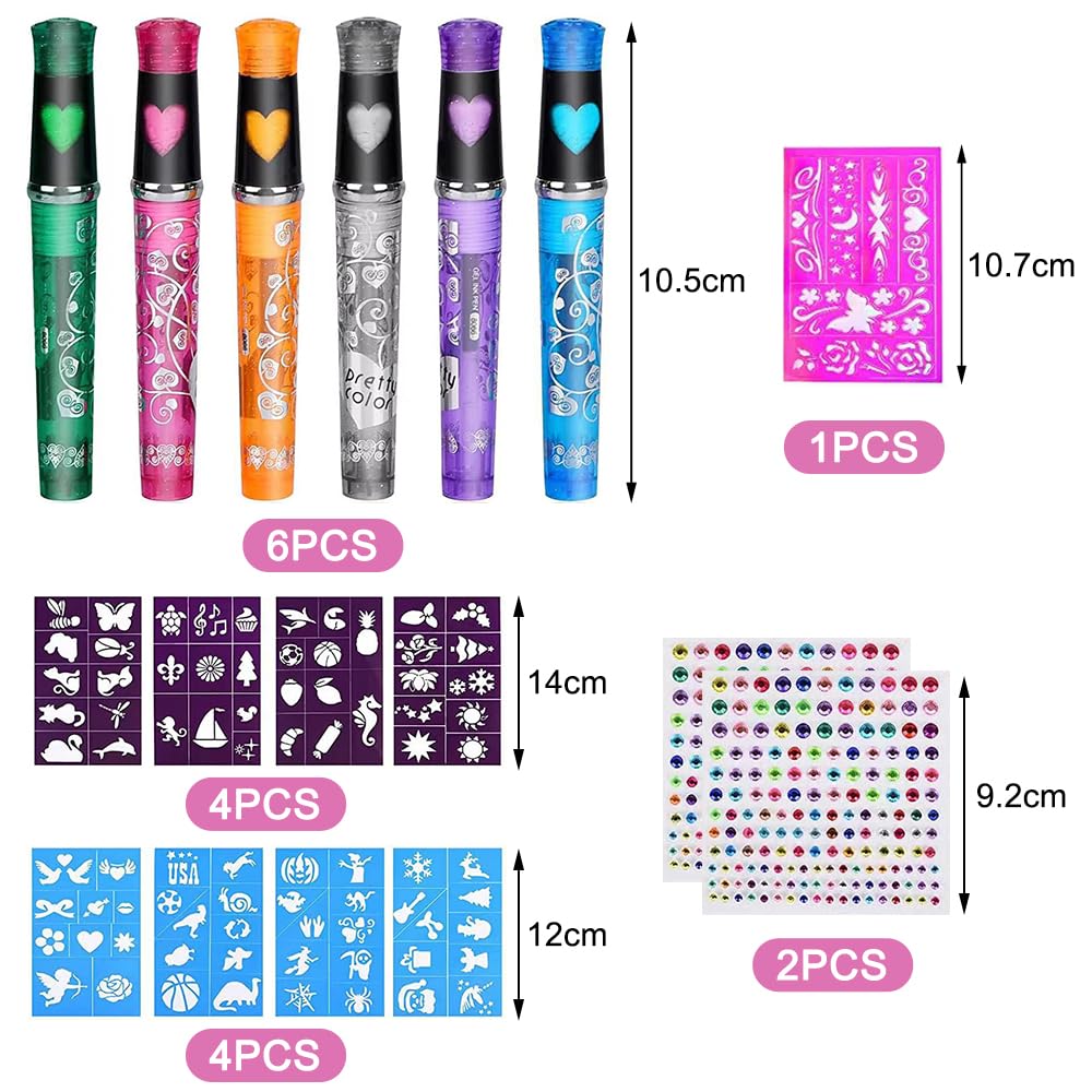 Tattoo Stifte 6 Farben Glitzer Set für Kinder, Tattoo Stifte für die Haut, mit 9 Schablone und 2 Blätter Glitzersteine Gesicht, Gelstifte Set für Halloween Party, Kinder Geschenk