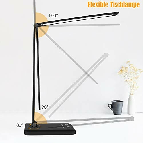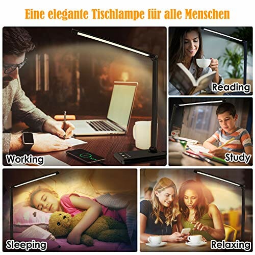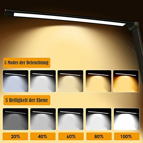 Przyjazna dla oczu: Przyjazna dla oczu lampa biurkowa: lampa robocza jest wyposażona w 5 trybów oświetlenia, 5 poziomów jasności, timer i funkcja pamięci, przyjazne dla oczu miękkie światło o temperaturze barwowej 3000-6000 K, niemigoczące diody LED.