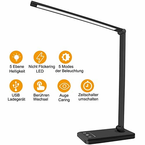 • Szczególne zastosowania: ‎Ściemniana lampa biurkowa LED do czytania, nauki pracy, ochrona oczu. 5 trybów oświetlenia, funkcja timera, przełącznik dotykowy