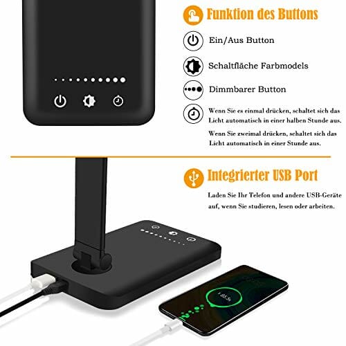 Dodatkowa funkcja: lampa: Dodatkowa funkcja: lampa biurkowa LED z możliwością ściemniania jest wyposażona w port ładowania USB z tyłu do ładowania urządzeń USB, wyjście 5 V/1 A. Funkcja timera wynosi 30 minut i godzinę jako tryb uśpienia.
