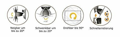• Obrotowy, regulowany i obrotowy: dzięki ruchomemu uchwytowi ściennemu można pochylać i obracać telewizor o +/- 20°. Uchwyt ścienny obraca się o 90° i do maks. 12 kg