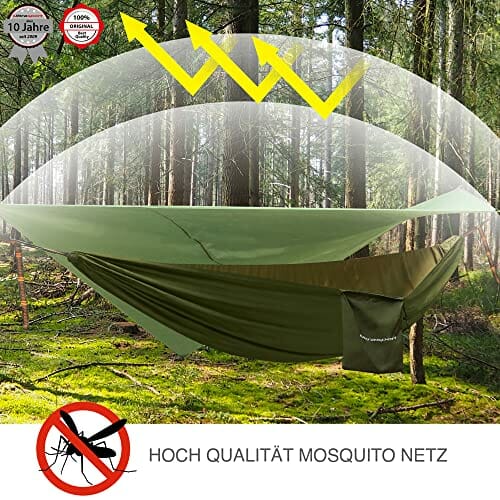 • Hamak firmy Ultrasport na wędrówki i urlop na kempingu lub trening survivalowy jest dostarczany w komplecie z moskitierą o bardzo dużej gęstości, dzięki czemu małe zwierzęta i owady nie mogą dostać się do środka