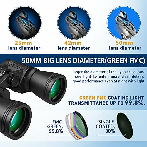 • Wydajna lornetka – obiektyw o wielkości 26 mm: średnica soczewki ocznej 26 mm i średnica obiektywu 50 mm, duże pole widzenia. Soczewka oczkowa 26 mm zbiera więcej światła niż inne (np. lornetka 10 x 25, 12 x 25, 10 x 21 i normalna lornetka 10 x 42, 12 x 42) dla wyraźniejszego i jaśniejszego widzenia. Idealna lornetka dla dorosłych do obserwacji ptaków, polowań, kempingu, wędrówek, uprawiania sportu i obserwacji gwiazd.
