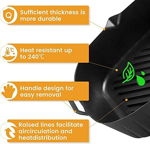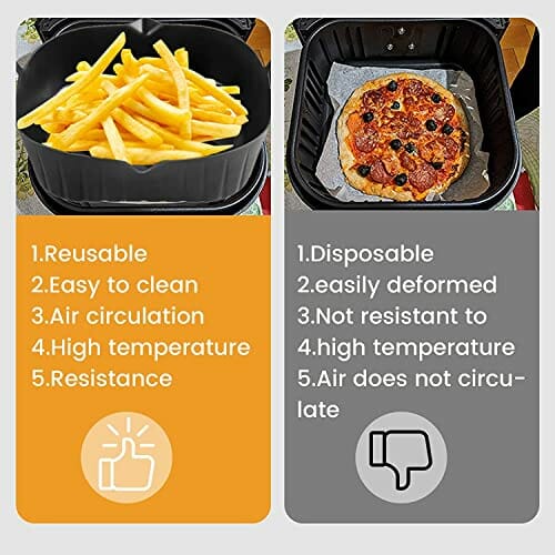 - 🍕【Wiederverwendbare Silikon-Luftfritteuse】 Der Innenkorb unserer Luftfritteuse hat eine schmutzabweisende Oberfläche, ist leicht zu reinigen und zu trocknen und kann viele Male ohne Verformung oder Beschädigung wiederverwendet werden, was umweltfreundlicher und wirtschaftlicher ist. Außerdem ist es spülmaschinenfest, wodurch lästiges Händewaschen vermieden wird.