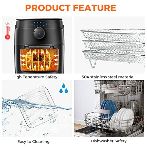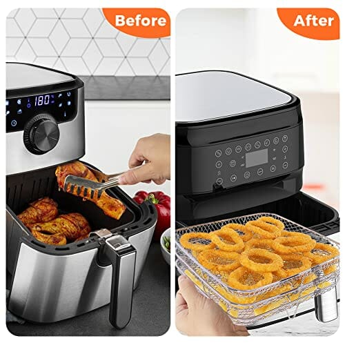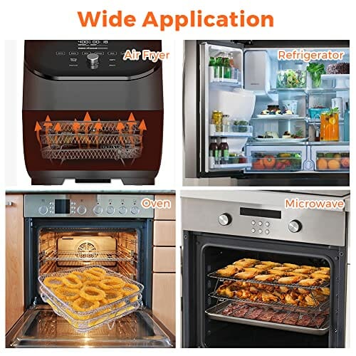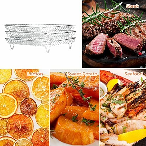• Praktisch: Jedes stapelbare Regal verfügt über ein Gitterkorb-Design, Lebensmittel im Regal lassen sich so einfach herausnehmen wie hineinlegen, Sie müssen sich keine Sorgen machen, dass Lebensmittel beim Herausnehmen des Regals herausfallen. Sie können auch verschiedene Lebensmittel mit Ihrer Luft zubereiten Friteuse gleichzeitig.