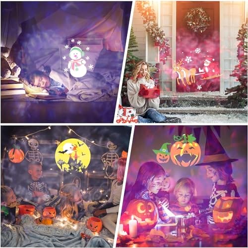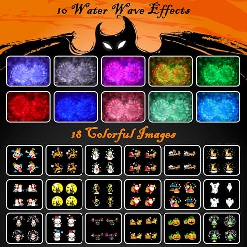 • 【18 wzorów i 10 fal wodnych】Światła projektora zawierają 18 wyjątkowych diamentów i 4-kolorowe światło fali wodnej. Wzory takie jak choinka, Święty Mikołaj, łoś, Happy Birthday, duch Halloween, dynia, mumia, jajka wielkanocne, czerwono-zielono-niebiesko-biała fala wodna zanurza się w gwiaździstym niebie i zapewniają lepszą atmosferę.