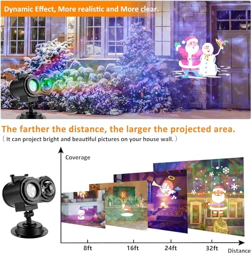 • 【Ulepszona funkcja dynamiczna】 Projektor bożonarodzeniowy ma wyższą rozdzielczość i większy zakres projekcji niż inni producenci. Każdy wzór ma cztery różne kształty i jest dynamicznie wyświetlany. Możesz wybrać wzory obrazów lub efekty fal wodnych lub łączyć dynamiczne wzory z falami oceanu lub statycznymi i dynamicznymi wzorami, aby stworzyć romantyczną atmosferę. Wygląda wspaniale na ścianie domu również w odległości ponad 10 metrów.