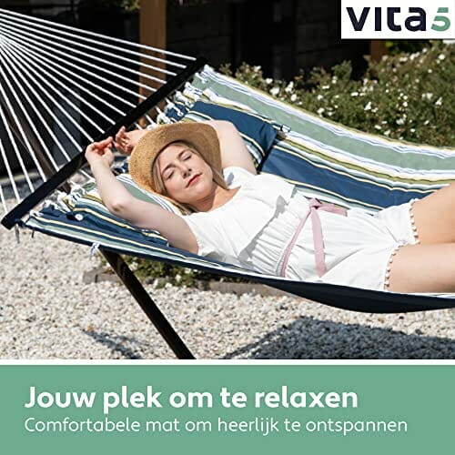 • Przyjemny materiał bawełniany – materiał hamaka ogrodowego ze stelażem jest miękki i oddychający. Dzięki odporności na promieniowanie UV żywy kolor materiału pozostaje zachowany. Podwójny hamak można również prać w pralce.