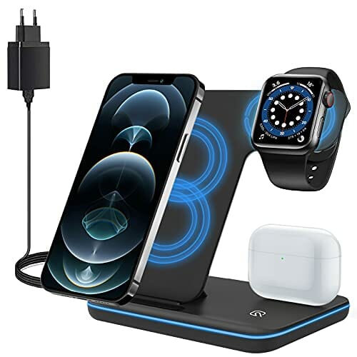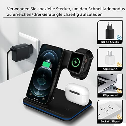 ZHIKE Bezprzewodowa ładowarka, 3 w 1 Qi stacja szybkiego ładowania z adapterem QC3.0 do Apple iWatch serii 7/6/5/4/3/2/1, AirPods pro/2, kompatybilna z iPhone serii 13/12/11/XS MAX/XR/XS/X/8/8 Plus/Samsung