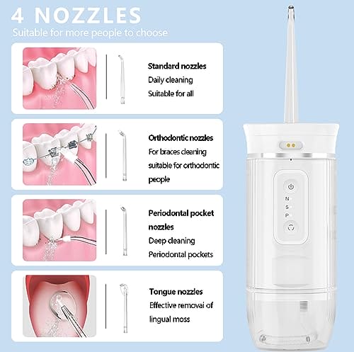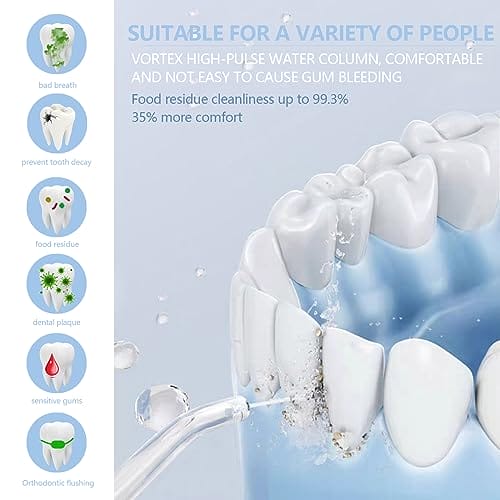 • Dysze obrotowe o 360°. Profesjonalny irygator do jamy ustnej, zaprojektowany specjalnie dla zdrowia zębów, z 2 dołączonymi dyszami funkcyjnymi i może być używany z rodziną. Nasz przenośny irygator do jamy ustnej zapobiega różnym problemom zdrowotnym jamy ustnej, takim jak nieświeży oddech, próchnica, krwawienie z dziąseł i żółte zęby. Skutecznie poprawia zdrowie dziąseł oraz dokładnie i dokładnie czyści każdy zakątek jamy ustnej, którego nie można osiągnąć konwencjonalne szczotkowanie.
